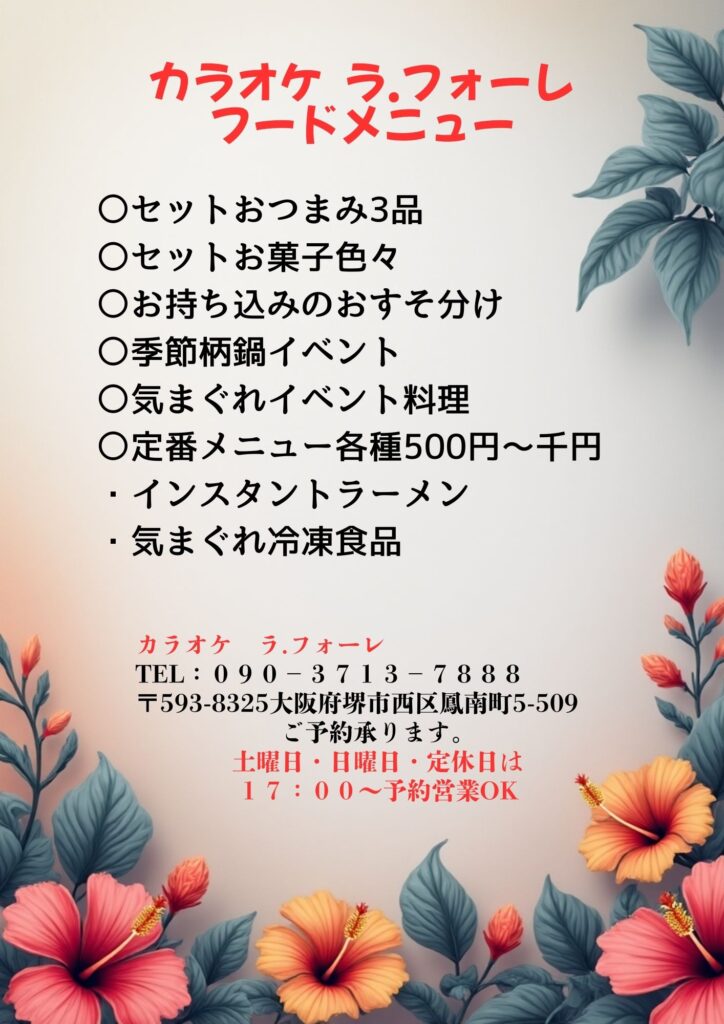 フードメニュー 2023.10.312026.01.07 ・チャーム(お菓子・チョコレートなど) 【軽食始めました】 カレー ラーメン カラオケ ラ.フォーレ TEL:恵美090-3713-7888 〒593-8325大阪府堺市西区鳳南町5-509 ご予約承ります。 土曜日・日曜日・定休日は 17:00~予約営業OK